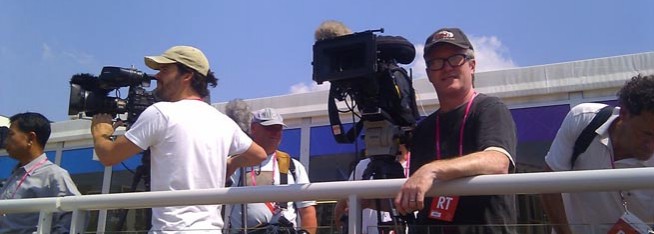 In the Olympic Village getting ready to film the welcoming ceremony for the Dutch Team. Really hot day too.